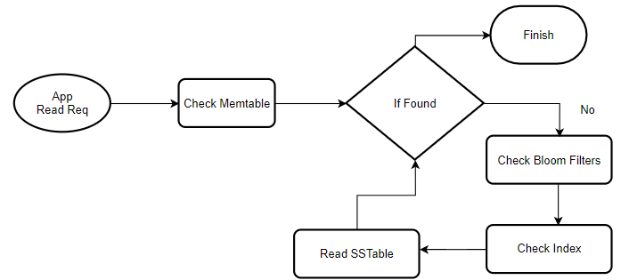 The read operation in an LSM Tree starts when a user requests to retrieve a specific key or data. Since data is spread across both memory (in the Memtable) and disk (in multiple SSTables), the system (DB) must check multiple locations to retrieve the latest value for a key. The search process begins in the Memtable, as it contains the most recent data, including updates not yet flushed to disk. If the key is found here, the value is returned immediately. However, if the key is not found in the Memtable, the system then checks the SSTables on disk. To speed up this process, each SSTable is accompanied by Bloom Filters and indexes. Bloom Filters, probabilistic data structures, help quickly rule out SSTables that do not contain the key, reducing unnecessary file accesses. If a Bloom Filter indicates the possible presence of a key, the system uses the SSTable’s internal index to locate the exact position of the key in the file.