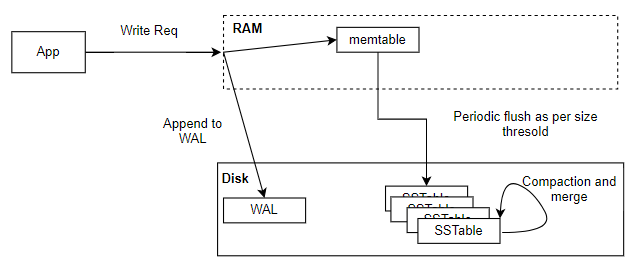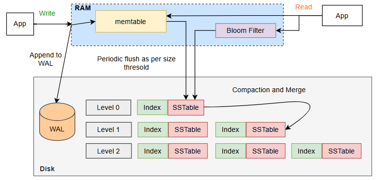 - A Compaction process periodically merges these SSTables, removing duplicates and consolidating data to reduce disk space usage.